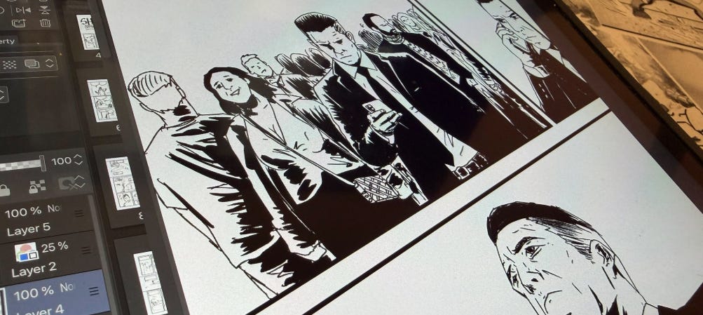Currently greytoning the first 20-pages while Tommy finishes the last 20 pages. The delay on this project is 100% my fault as I didn’t give Tommy the changed scripts and sketches in a timely manner.
